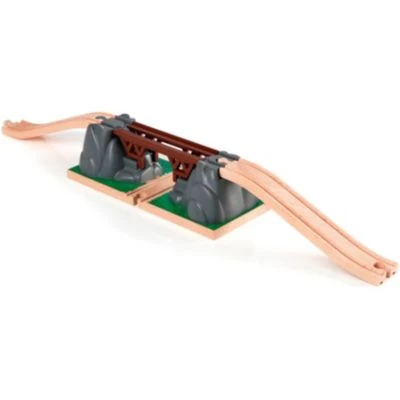 Drück auf den Knopf, dann stürzt die Brücke ein! Brücke mit einstürzendem Mittelteil, zwei Rampengleisen und einer hölzernen Grundplatte mit Gleis. Die Brücke lässt sich im Handumdrehen wieder aufbauen.