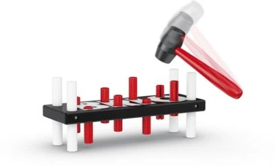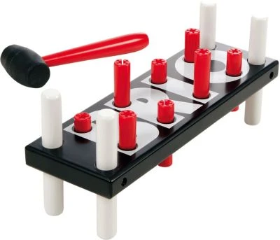 Mit diesem lustigen Spiel können schon die Kleinsten wie Bob der Baumeister mit einem Hammer werkeln. So können von beiden Seiten die roten Dübel in die Werkbank geklopft und gehämmert werden. Ganz nebenbei wird so noch die Hand-Auge-Koordination der Kleinen geschult.