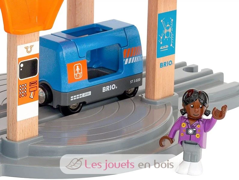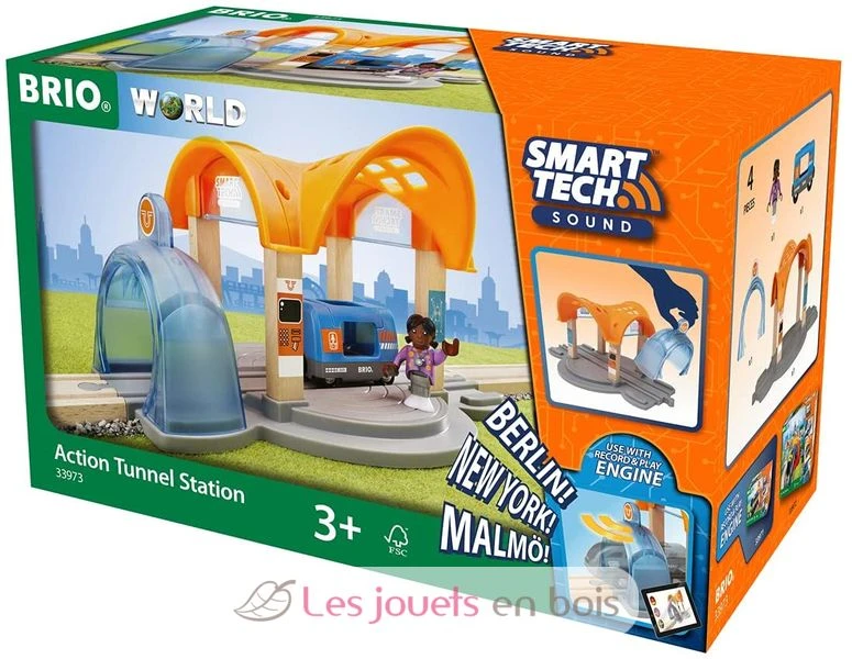 „Bitte alle einsteigen!“ Der Zug steht abfahrtsbereit am Bahnhof mit Action Tunnel Wenn er zusammen mit der Smart Tech Sound Lok (nicht enthalten) verwendet wird, weist der Bahnhofs Action Tunnel den Zug an, langsamer zu werden und ganz anzuhalten. Die Lichter leuchten auf, wenn der Zug am Bahnhof ankommt und es erklingt ein Bahnhofsgeräusch. Ganz wie in der richtigen Welt. Mit der Smart Tech Sound App kannst du das Bahnhofsgeräusch so ändern, dass es an berühmte Städte wie Berlin, London oder Paris erinnert. Der Zug ist angekommen. Hilf den Passagieren, den Passagierwaggon zu besteigen, und beginne deine Reise in die BRIO World.